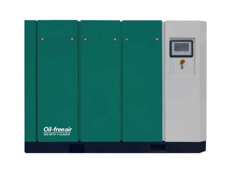 The compressed air of the oil-free screw air compressor is 100% pure oil-free, because it directly replaces the lubricating oil with water, and can also achieve the four effects oflubrication, cooling, sealing, and noise reduction, and the discharged water is pollution-free, very environmentally friendly.